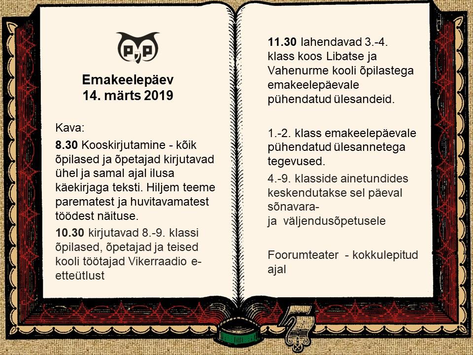 - 11.30 lahendavad 3.-4. klass koos Libatse ja Vahenurme kooli õpilastega emakeelepäevale pühendatud ülesandeid.