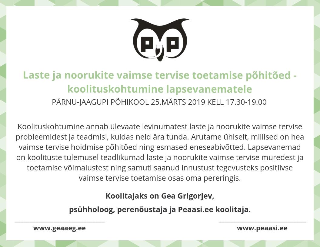 Lapsevanemate koolitus "Laste ja noorukite vaimse tervise toetamise põhitõed"