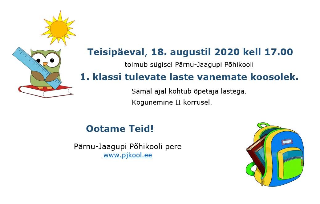 Teisipäeval, 18. augustil 2020 kell 17.00 toimub sügisel Pärnu-Jaagupi Põhikooli 1. klassi tulevate laste vanemate koosolek.