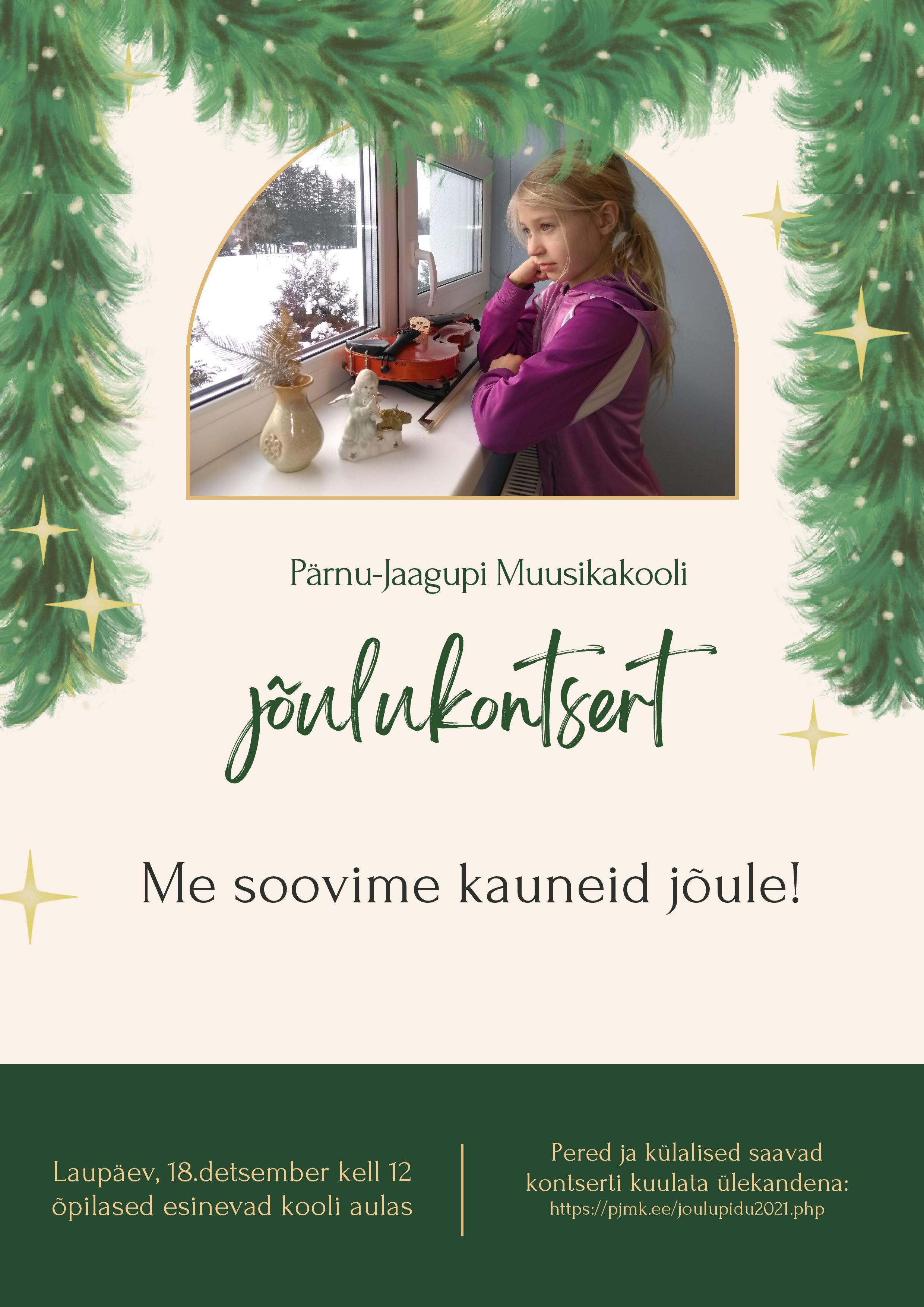 Pärnu-Jaagupi Muusikakooli jõulukontsert "Me soovime kauneid jõule!". Laupäev, 18. detsember kell 12.00 õpilased esinevad kooli aulas. Pered ja külalised saavadkontserti kuulata ülekandena https://pjmk.ee/joulupidu2021.php.