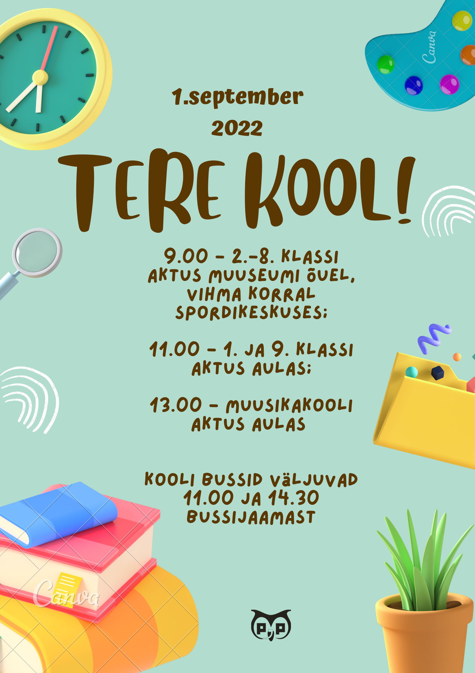 9.00 - 2.-8. klassi aktus muuseumi õuel, vihma korral spordikeskus; pärast aktust toimub klassijuhataja tund