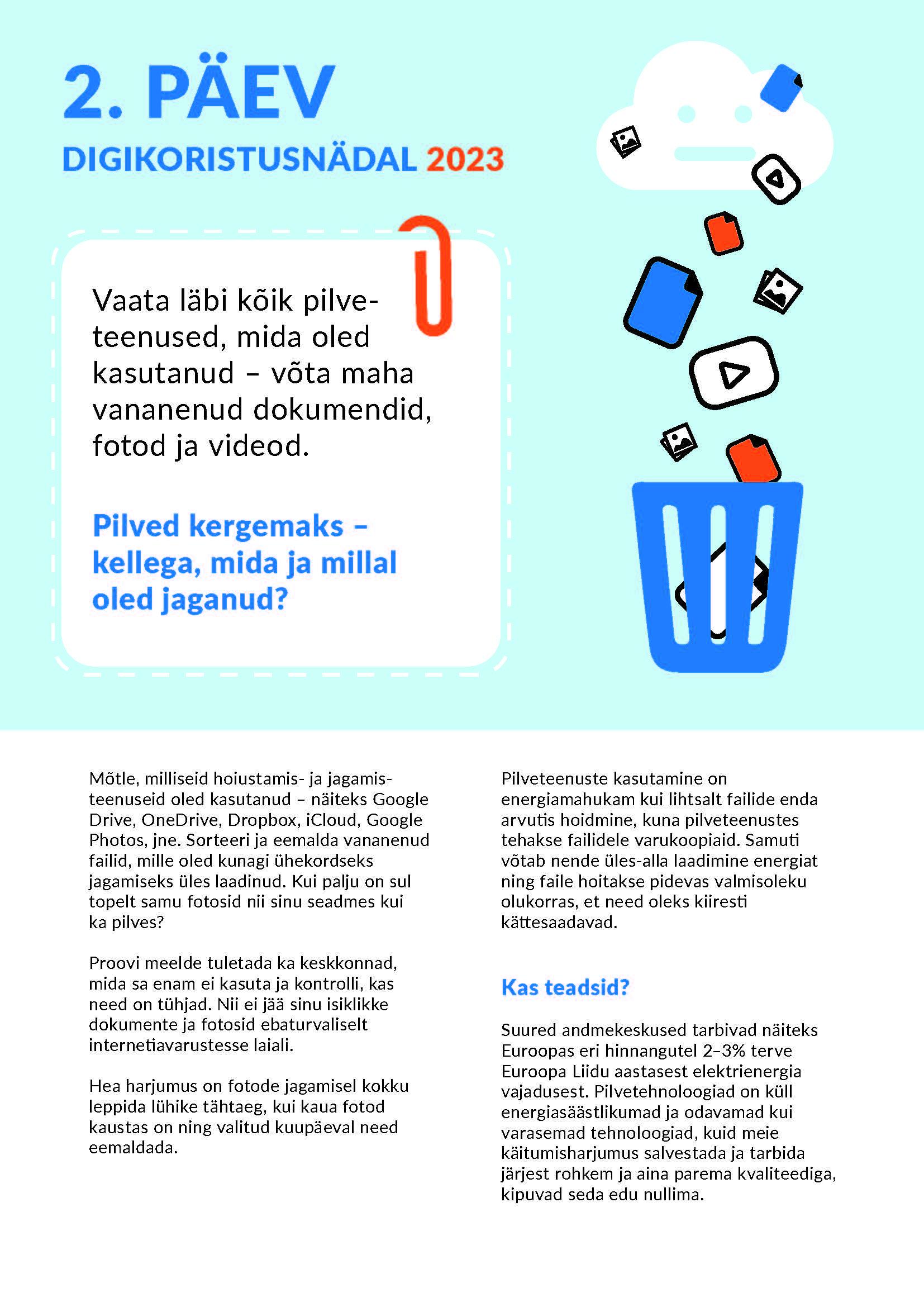 Mõtle, milliseid hoiustamis- ja jagamis- teenuseid oled kasutanud – näiteks Google Drive, OneDrive, Dropbox, iCloud, Google Photos, jne. Sorteeri ja eemalda vananenud failid, mille oled kunagi ühekordseks jagamiseks üles laadinud. Kui palju on sul topelt samu fotosid nii sinu seadmes kui ka pilves?