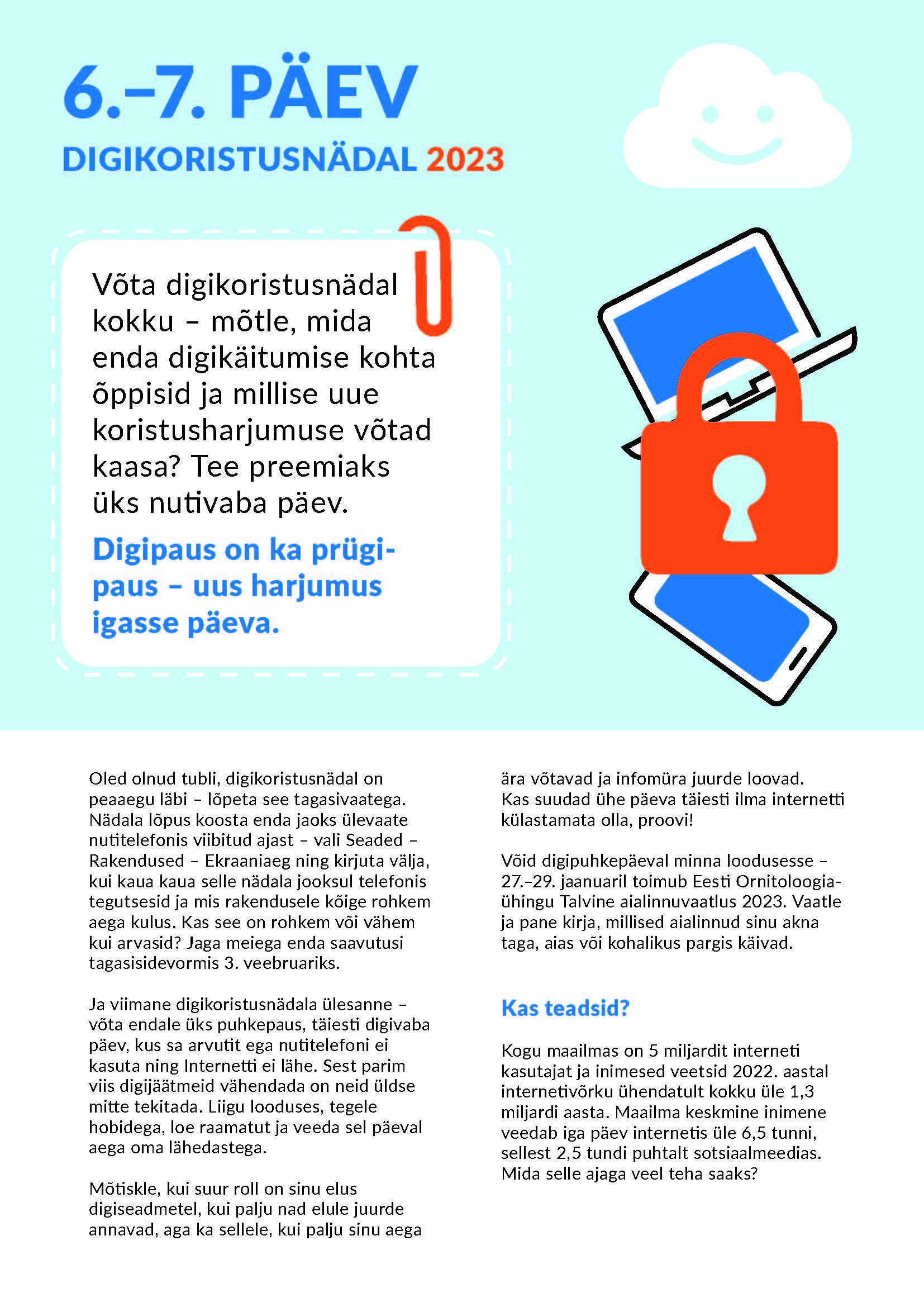 Ja viimane digikoristusnädala ülesanne – võta endale üks puhkepaus, täiesti digivaba päev, kus sa arvutit ega nutitelefoni ei kasuta ning Internetti ei lähe. Sest parim viis digijäätmeid vähendada on neid üldse mitte tekitada. Liigu looduses, tegele hobidega, loe raamatut ja veeda sel päeval aega oma lähedastega.