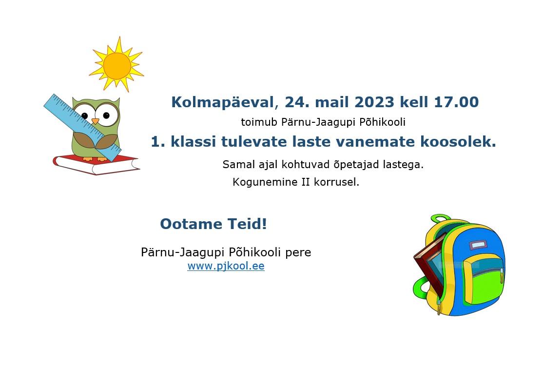 Kolmapäeval, 24. mail 2023 kell 17.00 toimub Pärnu-Jaagupi Põhikooli 1. klassi tulevate laste vanemate koosolek.