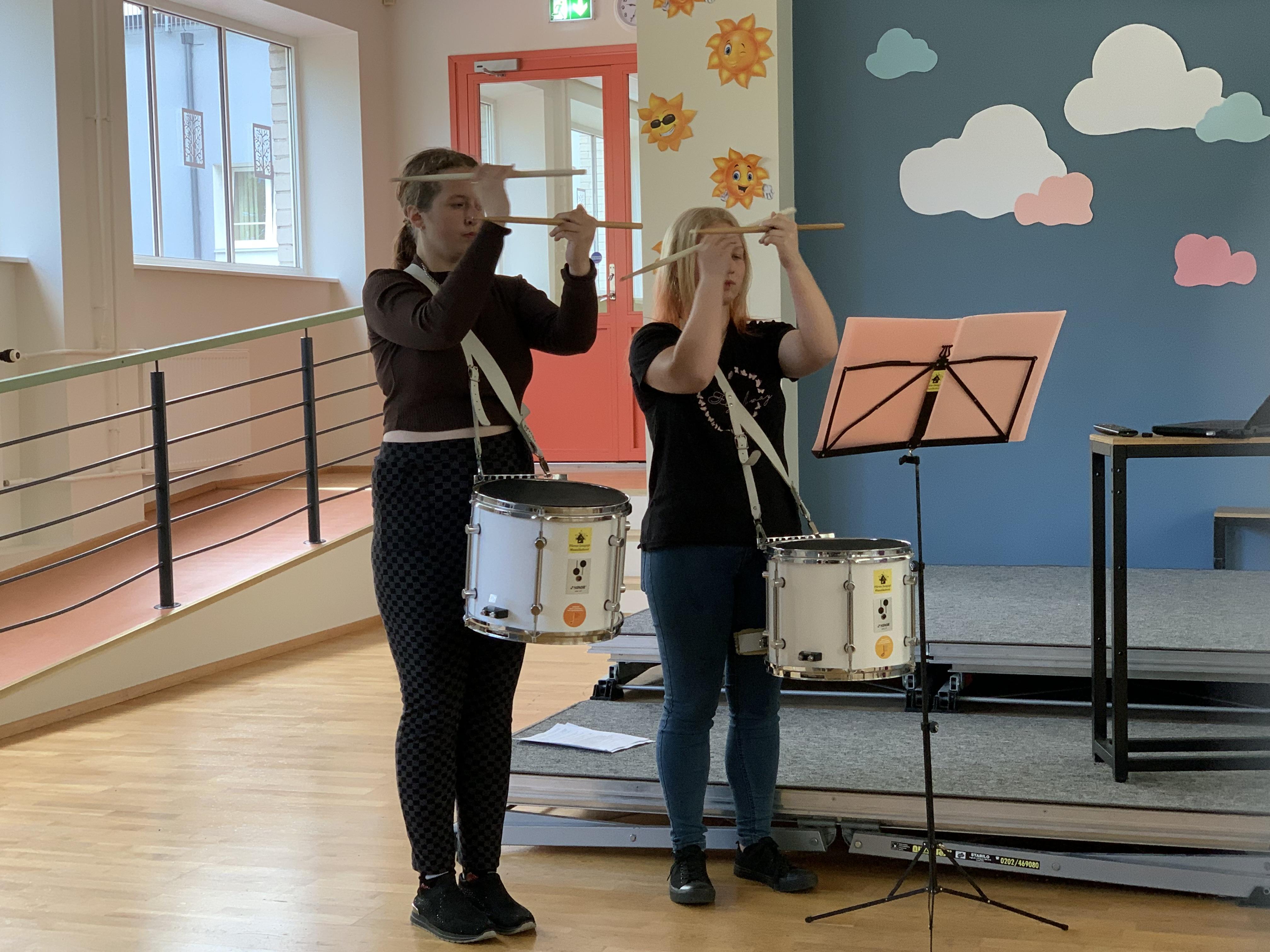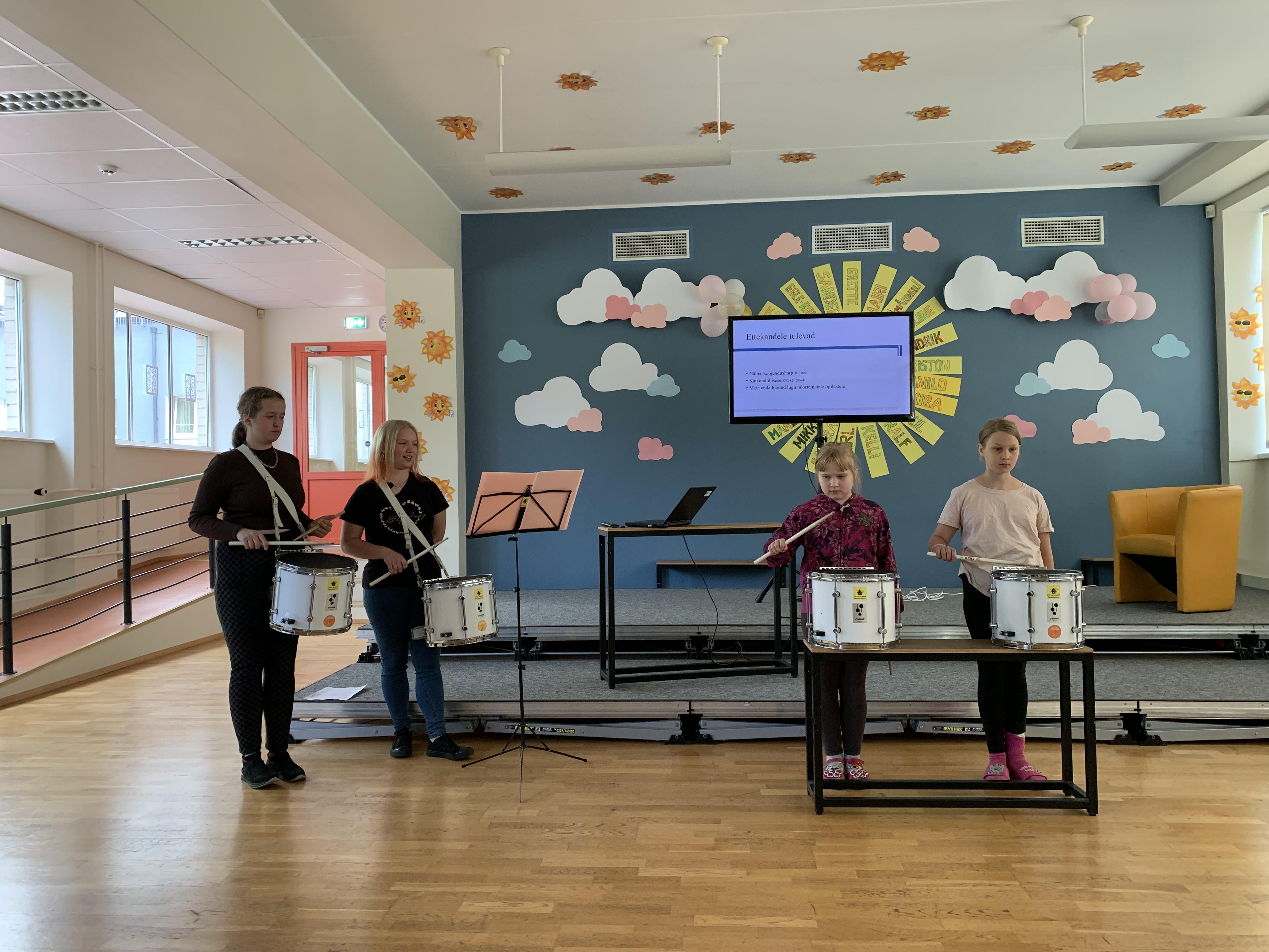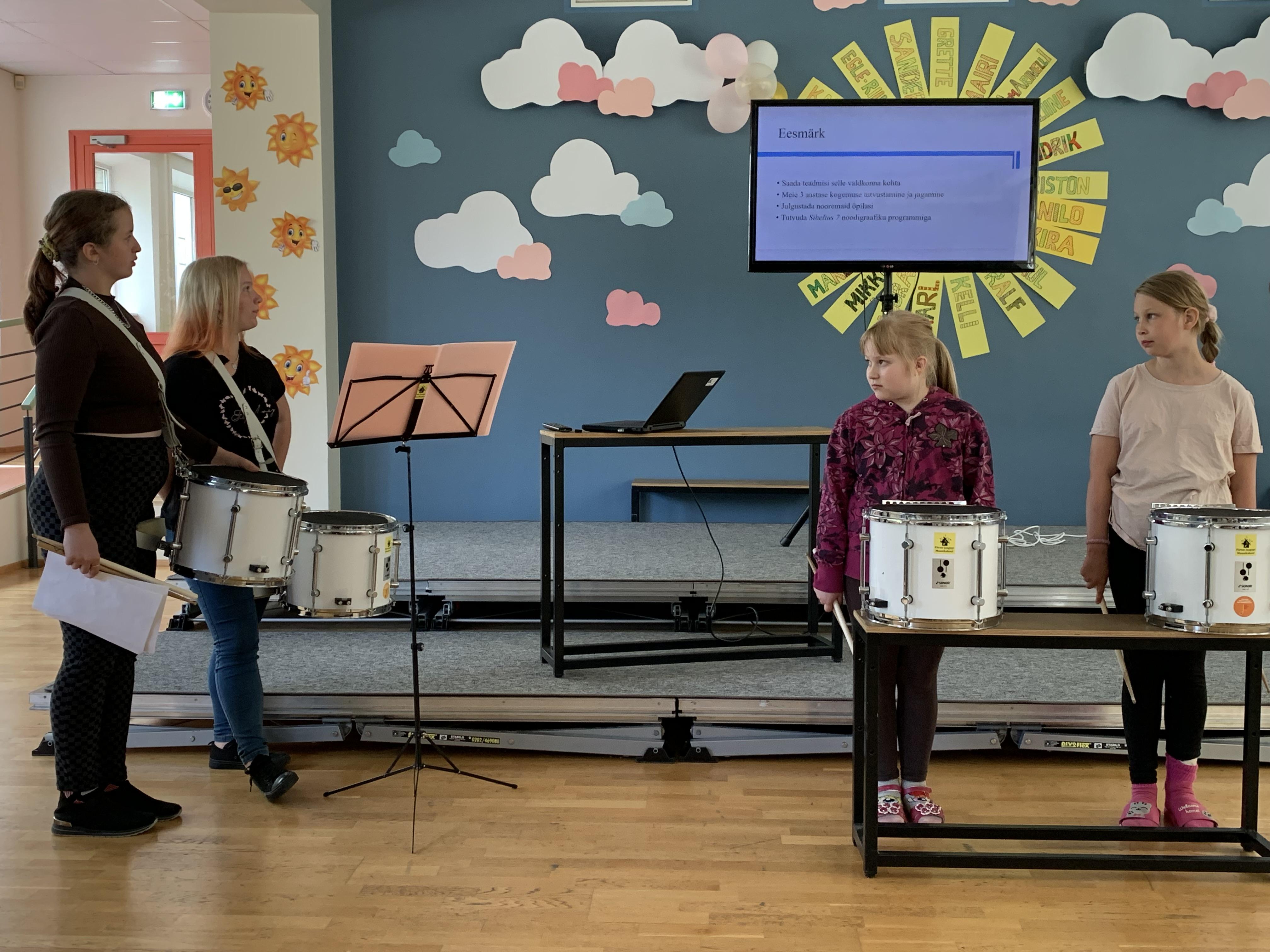 Kaidi ja Kaili tegid töö rivitrummidest. Nad ise mängivad rivitrummi juba mitu aastat. Töös oli toodud välja rivitrummide areng läbi meie Eestis. Praktiliseks pooleks olid neidu ise teinud loo väiksematele 2.klassi õpilastele, mida kuulajatel oli ka võimalus kuulda ja näha. Nende esitlus oli hästi õpetlik ja sisaldas palju praktilisi näited rivitrummidel.