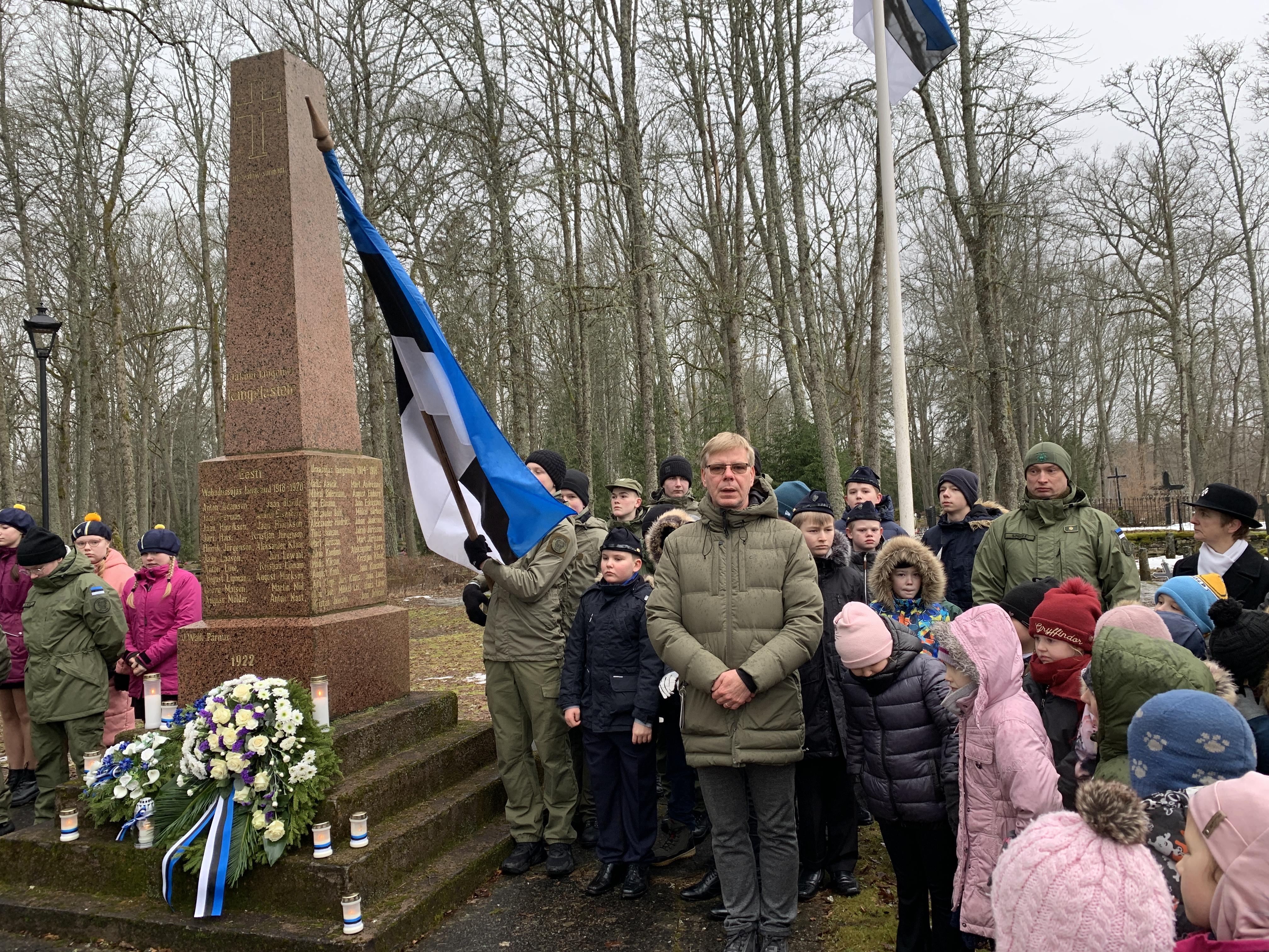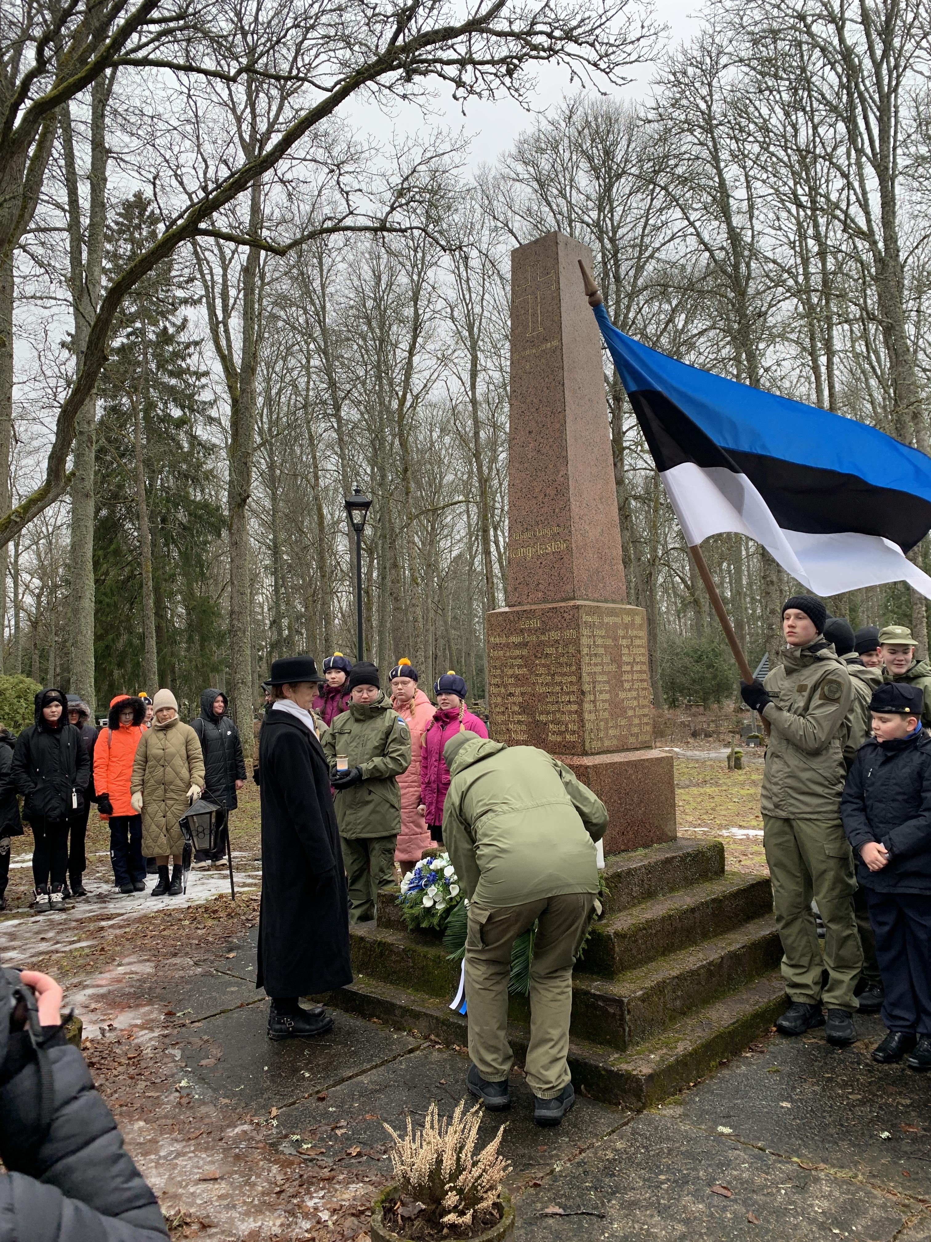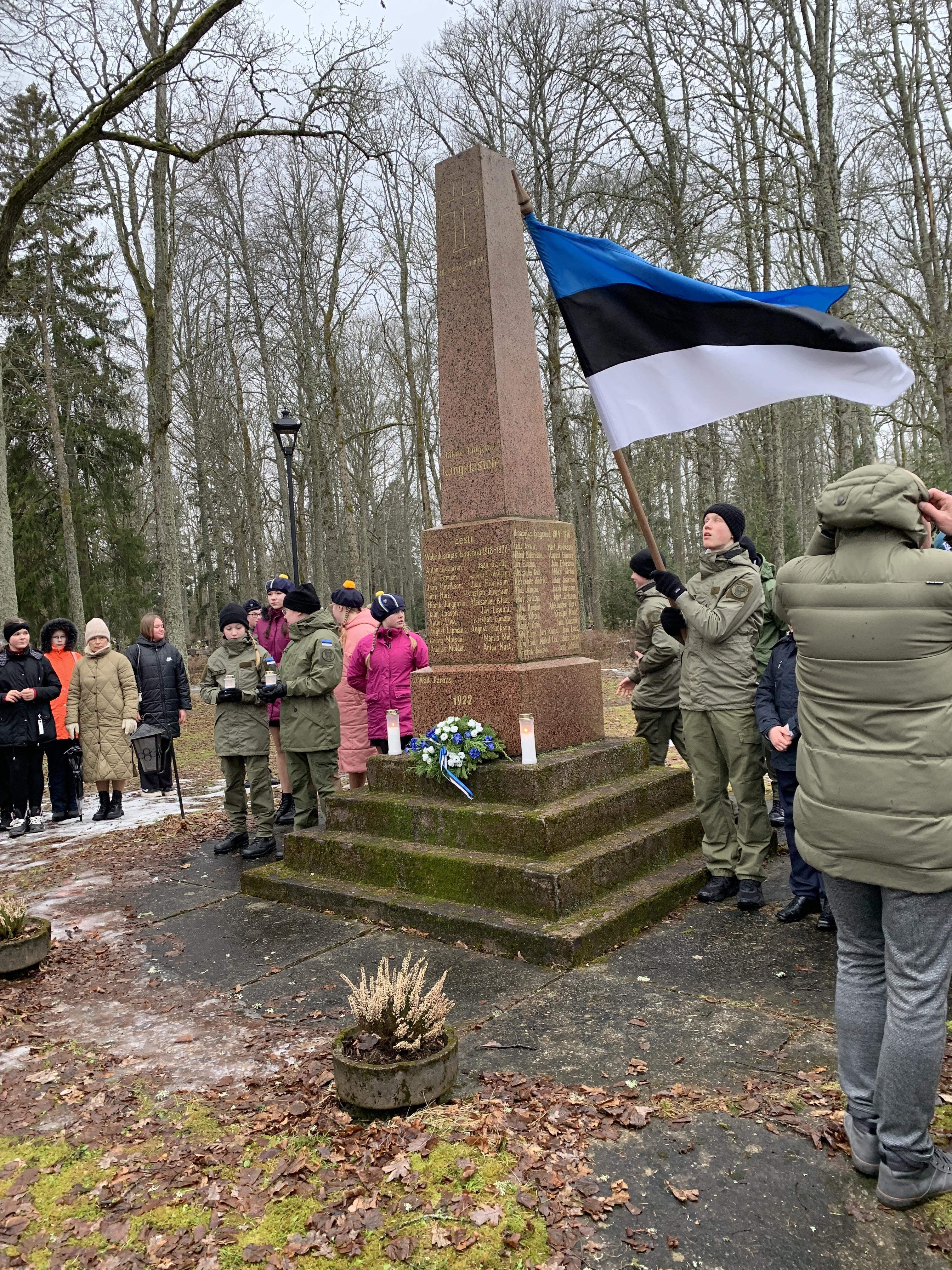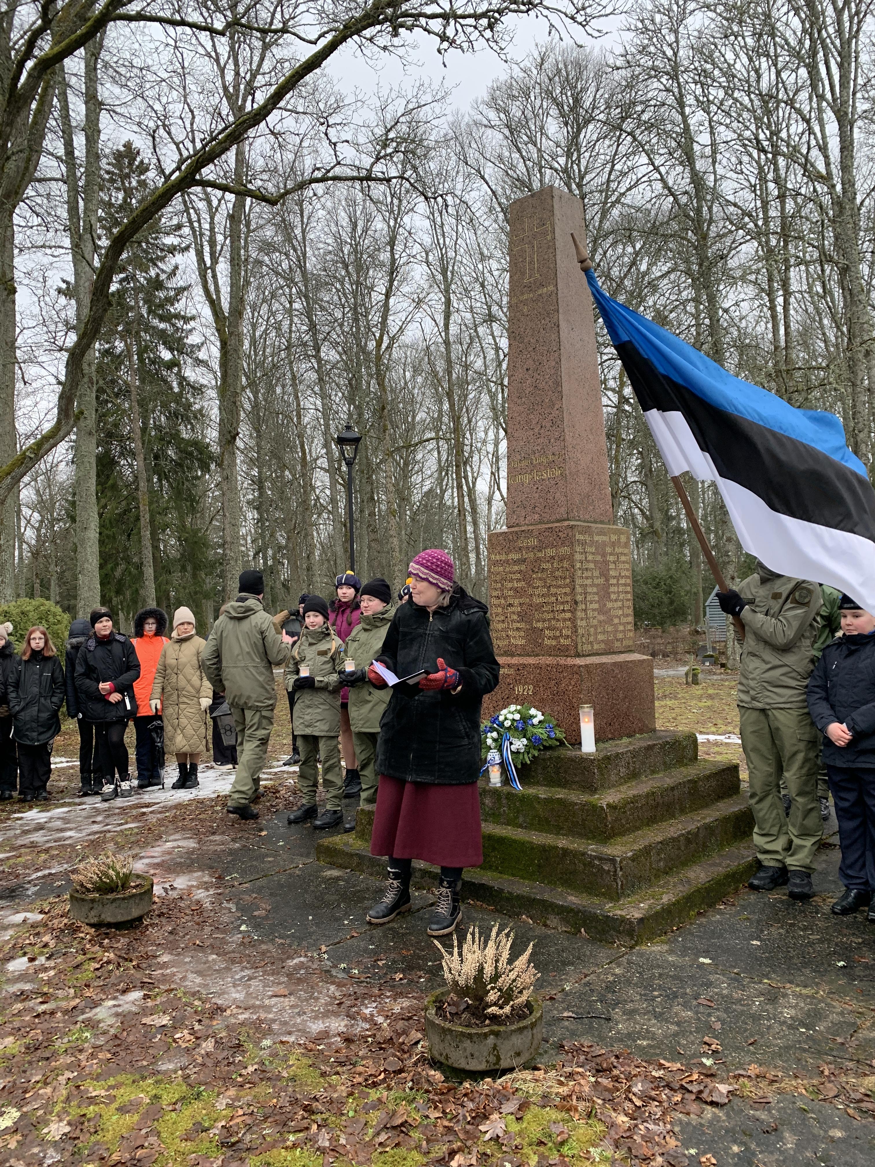 Õpetaja Tiiu oli ettevalmistanud ilusa sissejuhatuse meie üritustesse. Muuseumihoovilt suundusime ühise rongkäiguga kalmistule vabadussõja samba juurde, kus sõna said vallavanem Madis Koit, kirikuõpetaja Kristiina Jõgi. Üheskoos laulsime Hoia jumal Eestist ja mälestasime kangelasi.