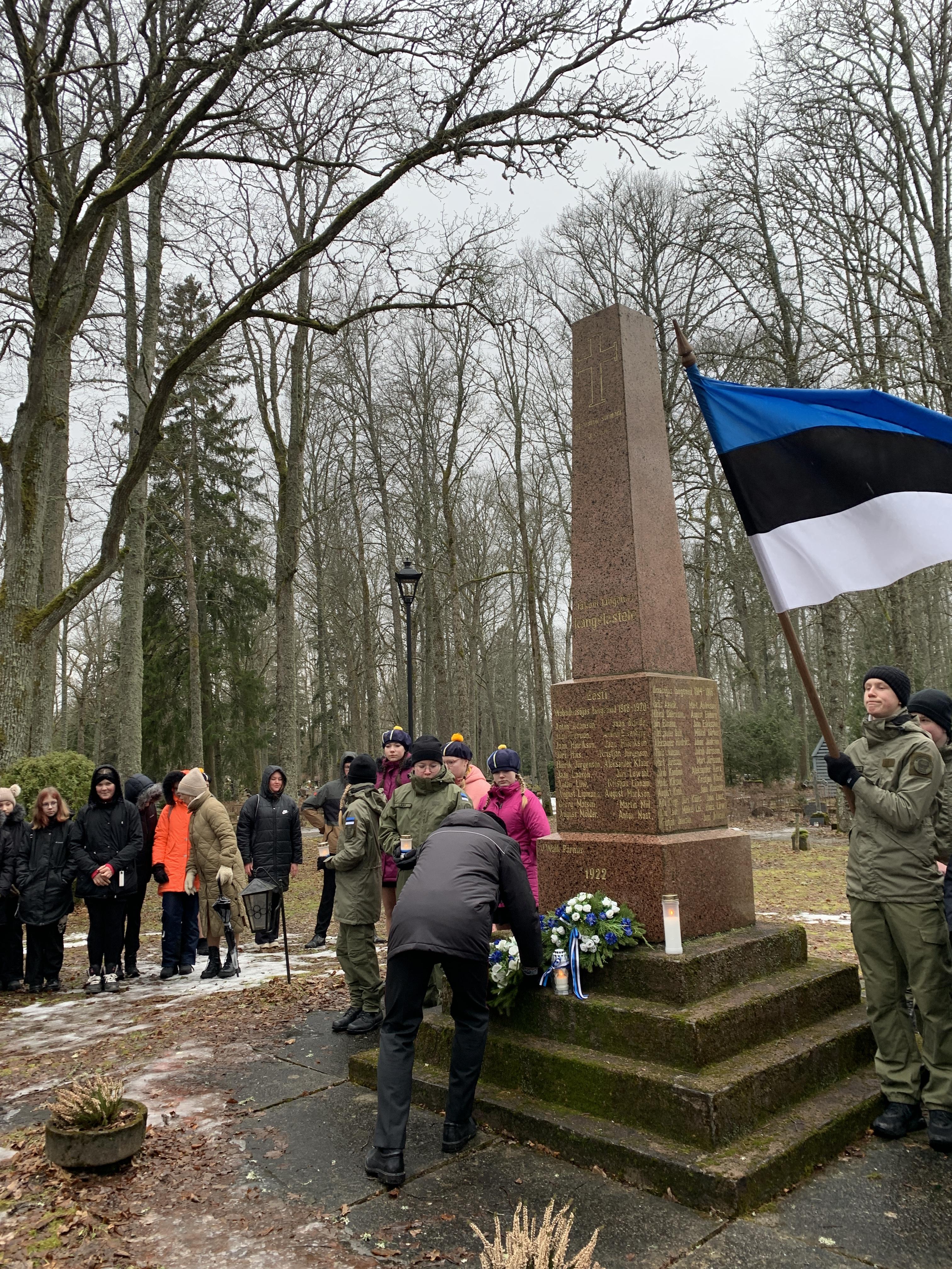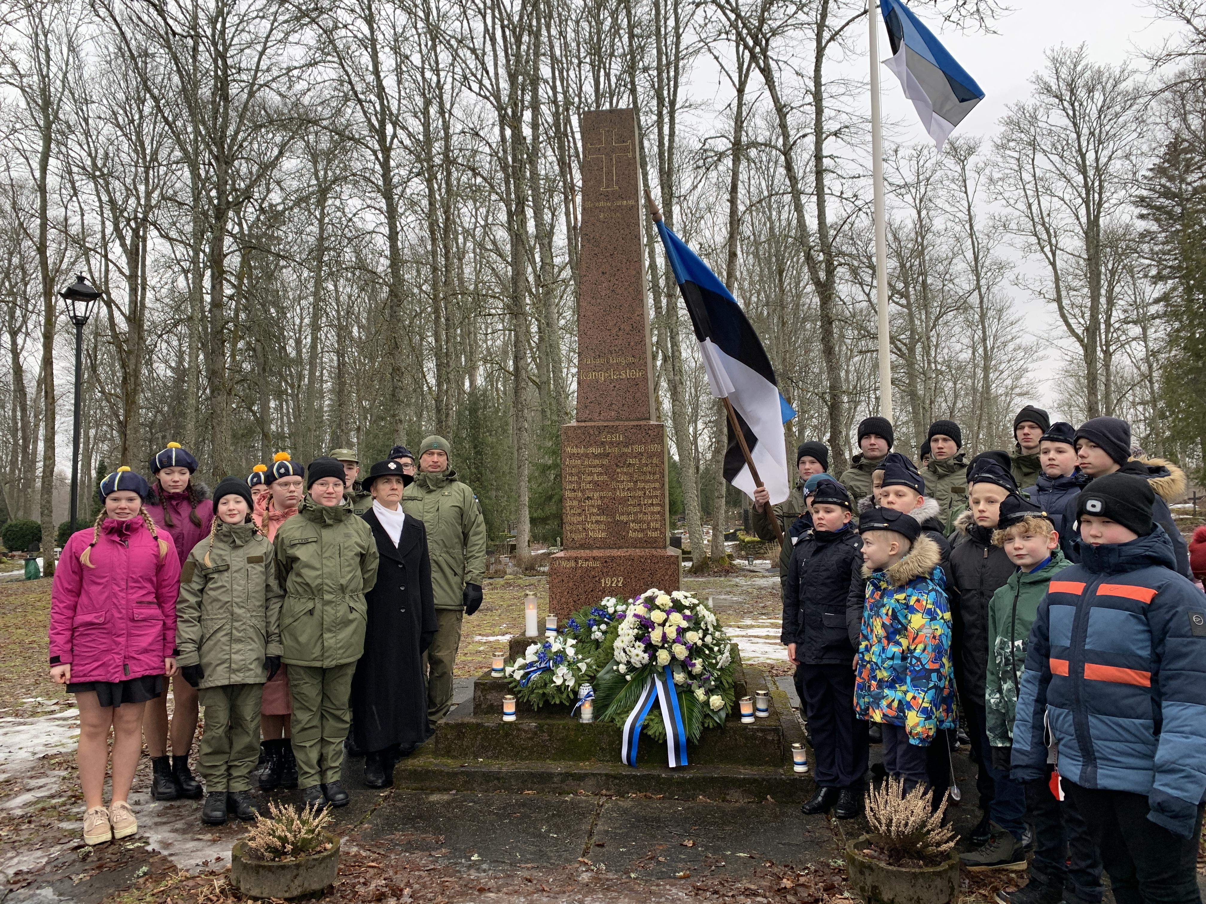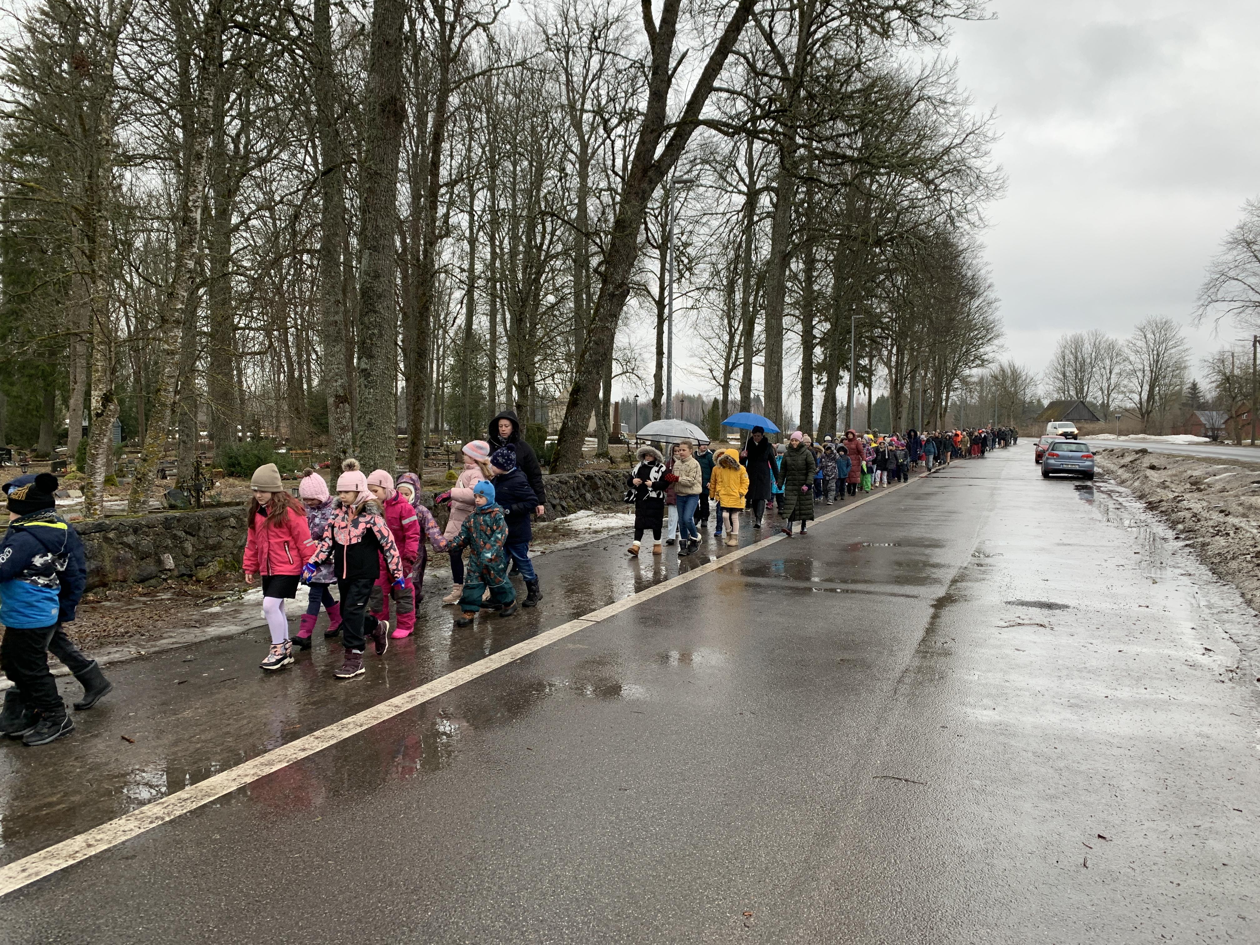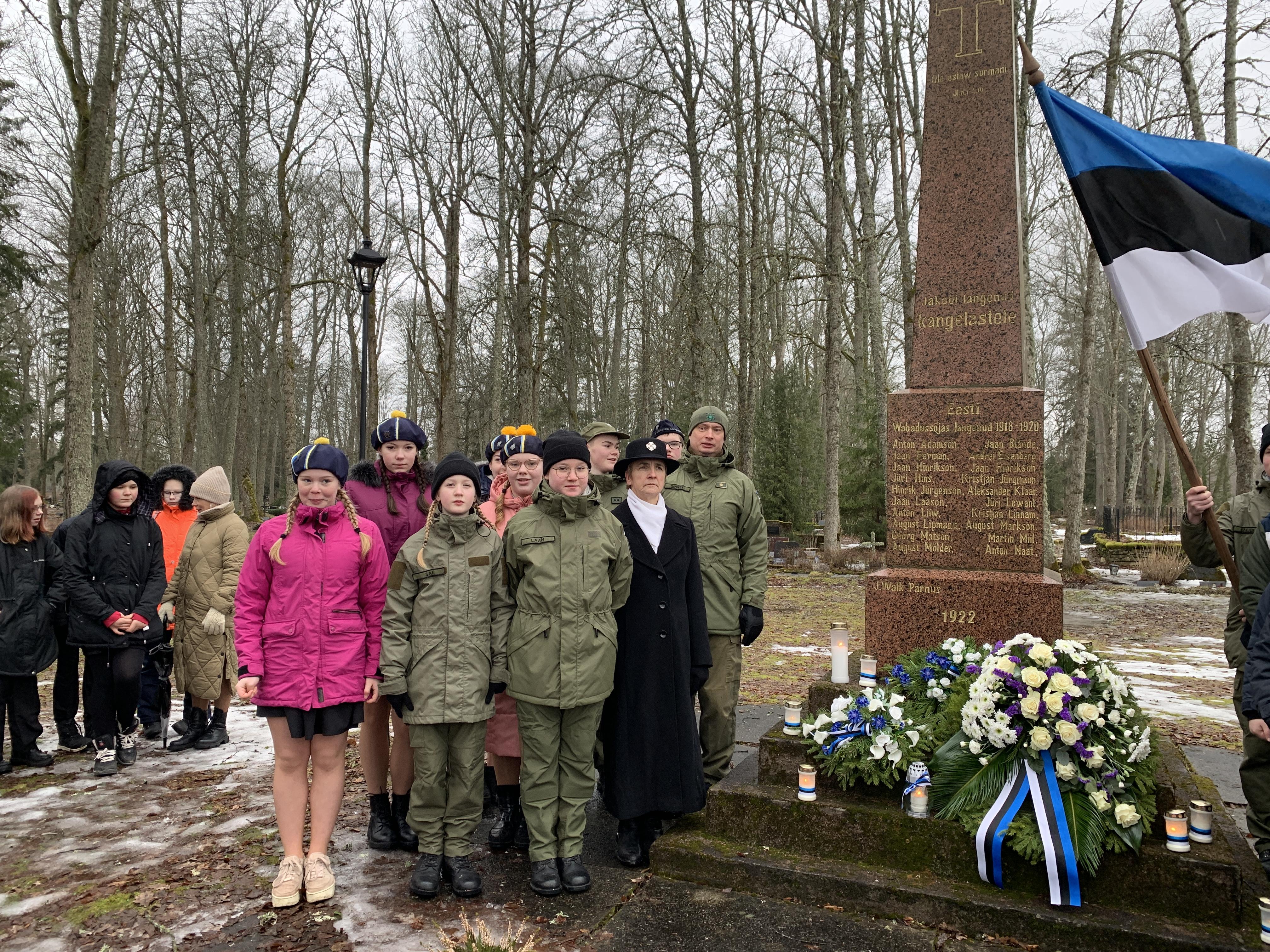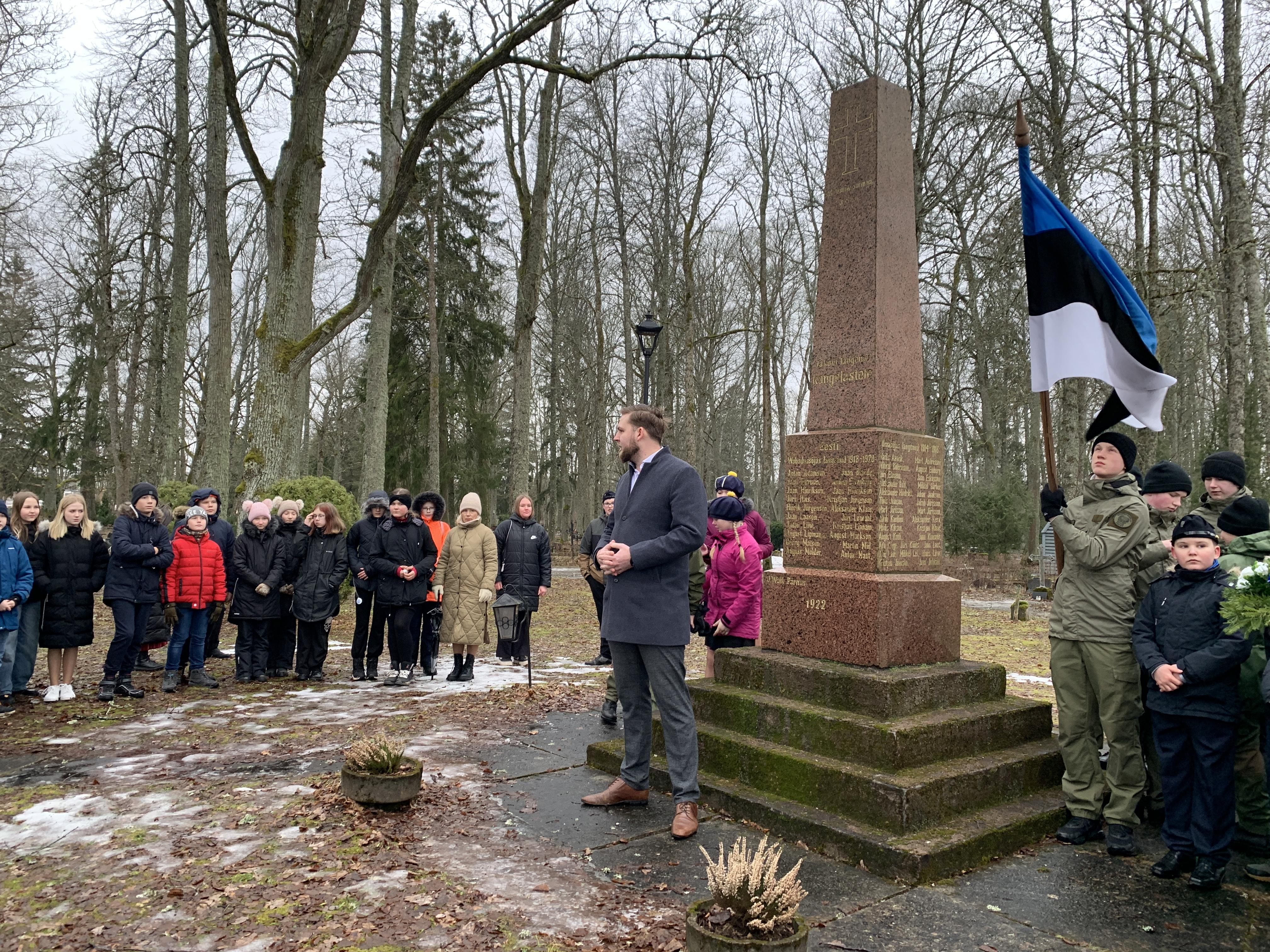 Õpetaja Tiiu oli ettevalmistanud ilusa sissejuhatuse meie üritustesse. Muuseumihoovilt suundusime ühise rongkäiguga kalmistule vabadussõja samba juurde, kus sõna said vallavanem Madis Koit, kirikuõpetaja Kristiina Jõgi. Üheskoos laulsime Hoia jumal Eestist ja mälestasime kangelasi.