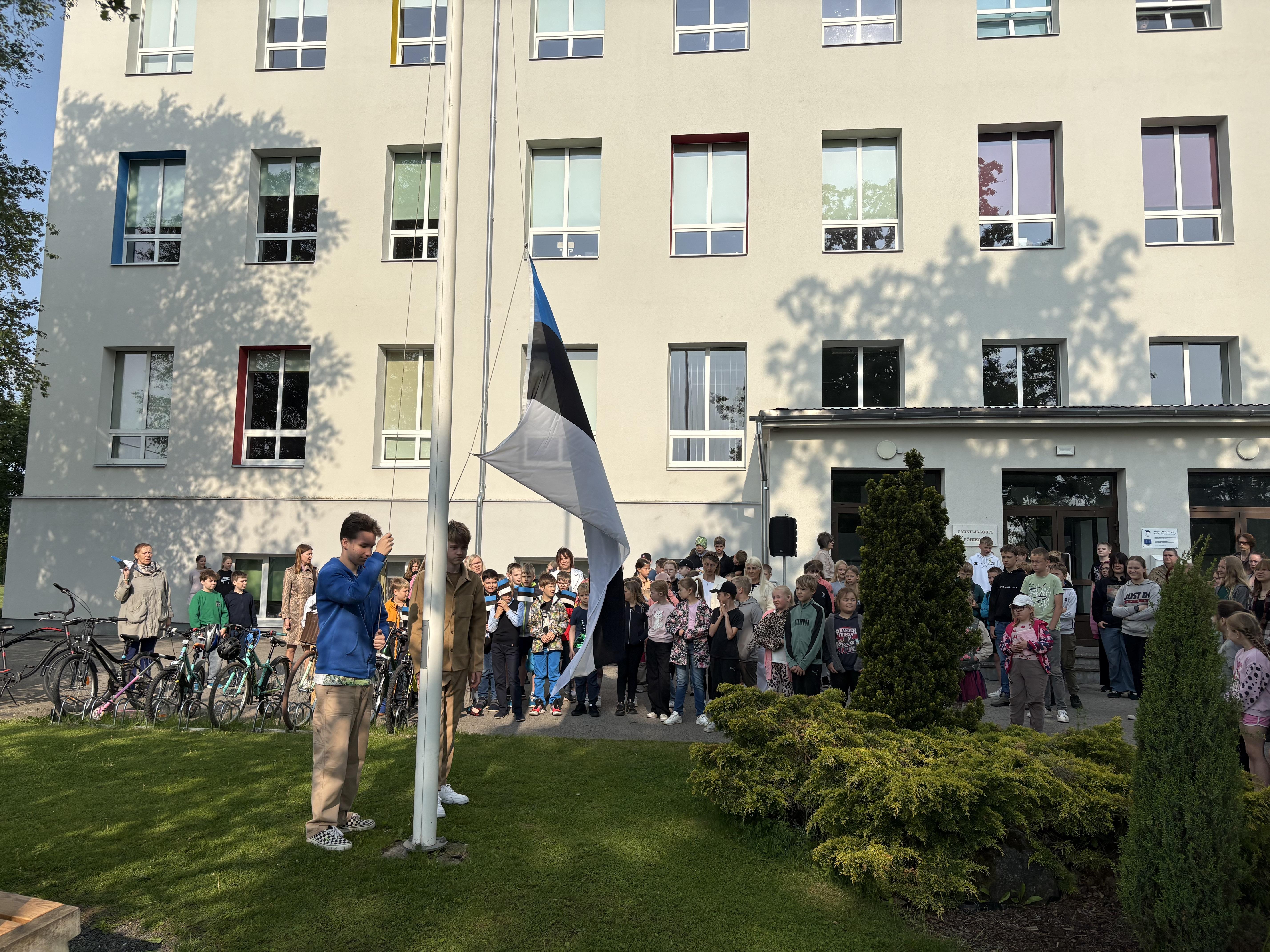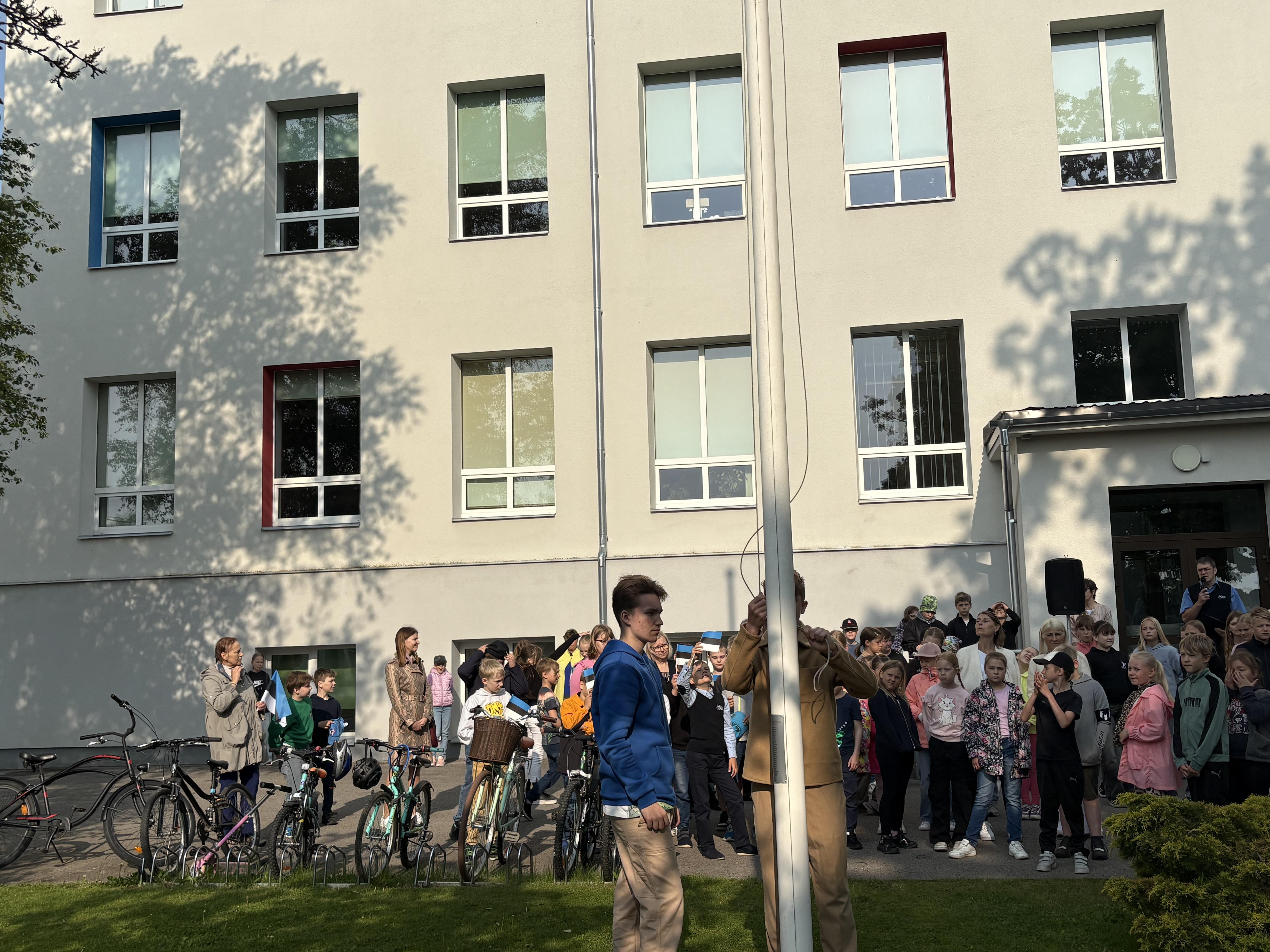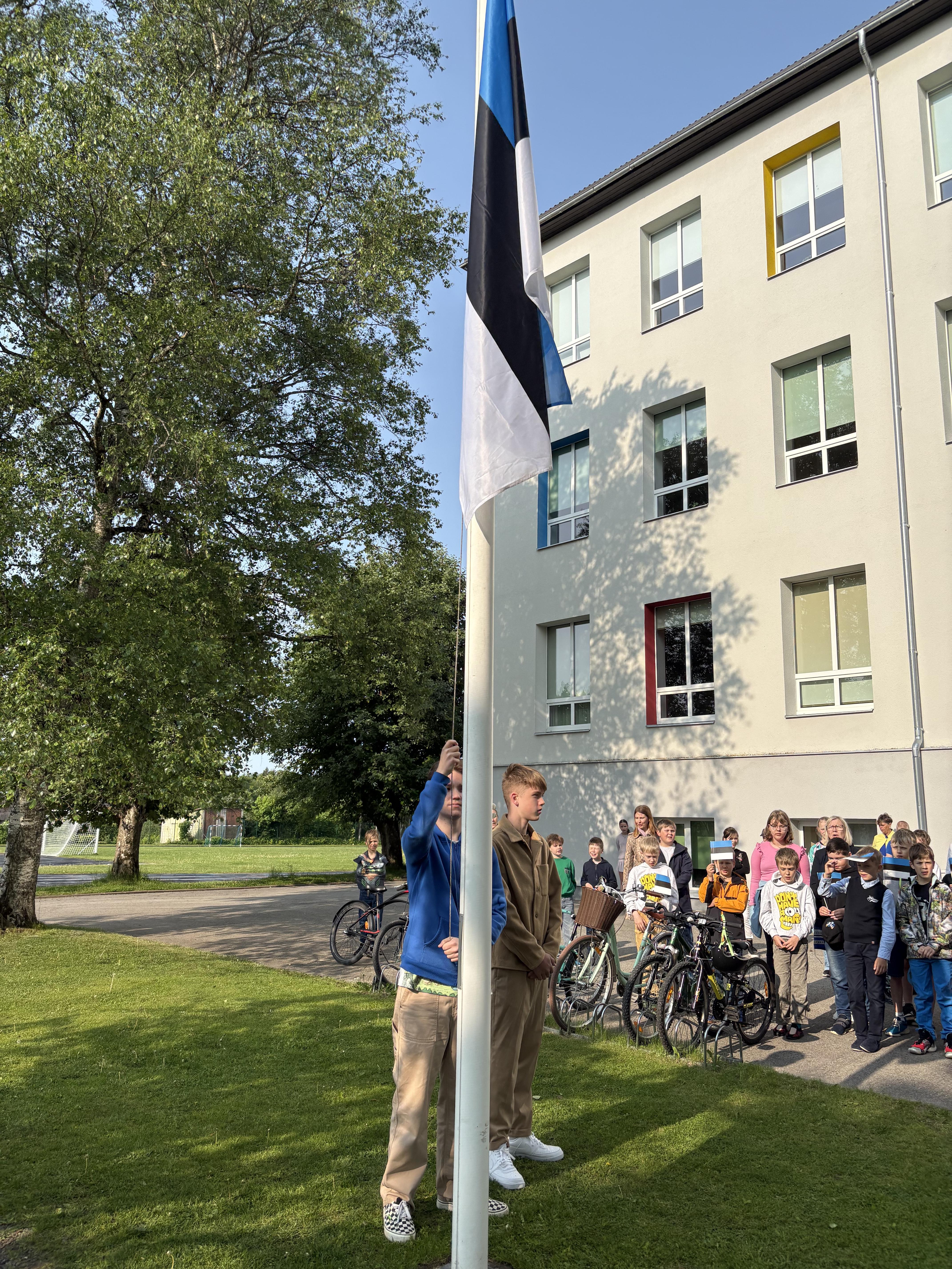 Robin ja Hendrik heiskasid hümni saatel lipu. Direktor Joel rääkis, kuidas sündis meie riigi lipp. Ürituse lõpetas meie Eesti lipu laul.