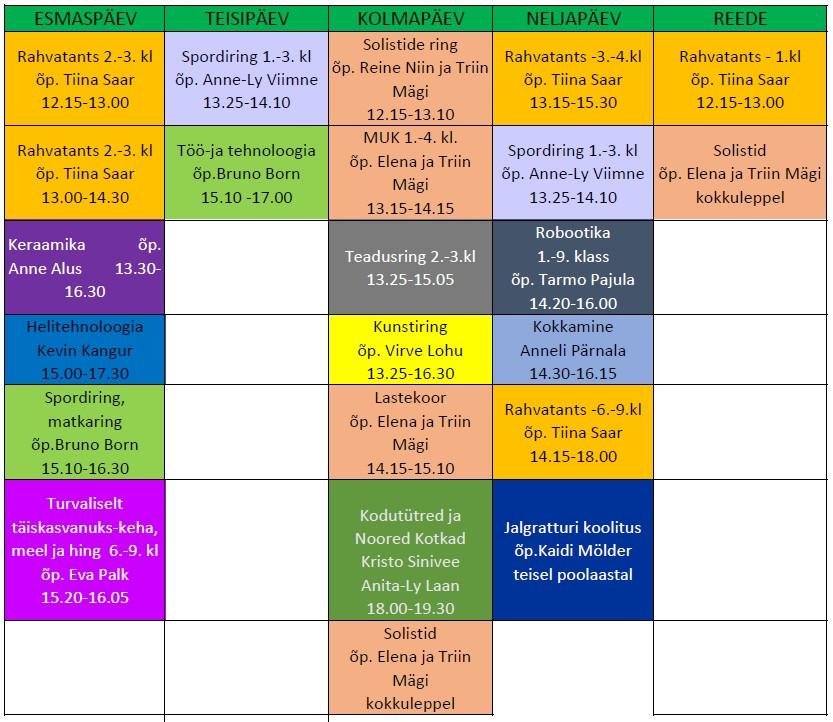 See on esialgne info järgmisel nädalal algavatest huviringidest. Need ajad võivad muutuda vastavalt õpilaste vajadustele.
