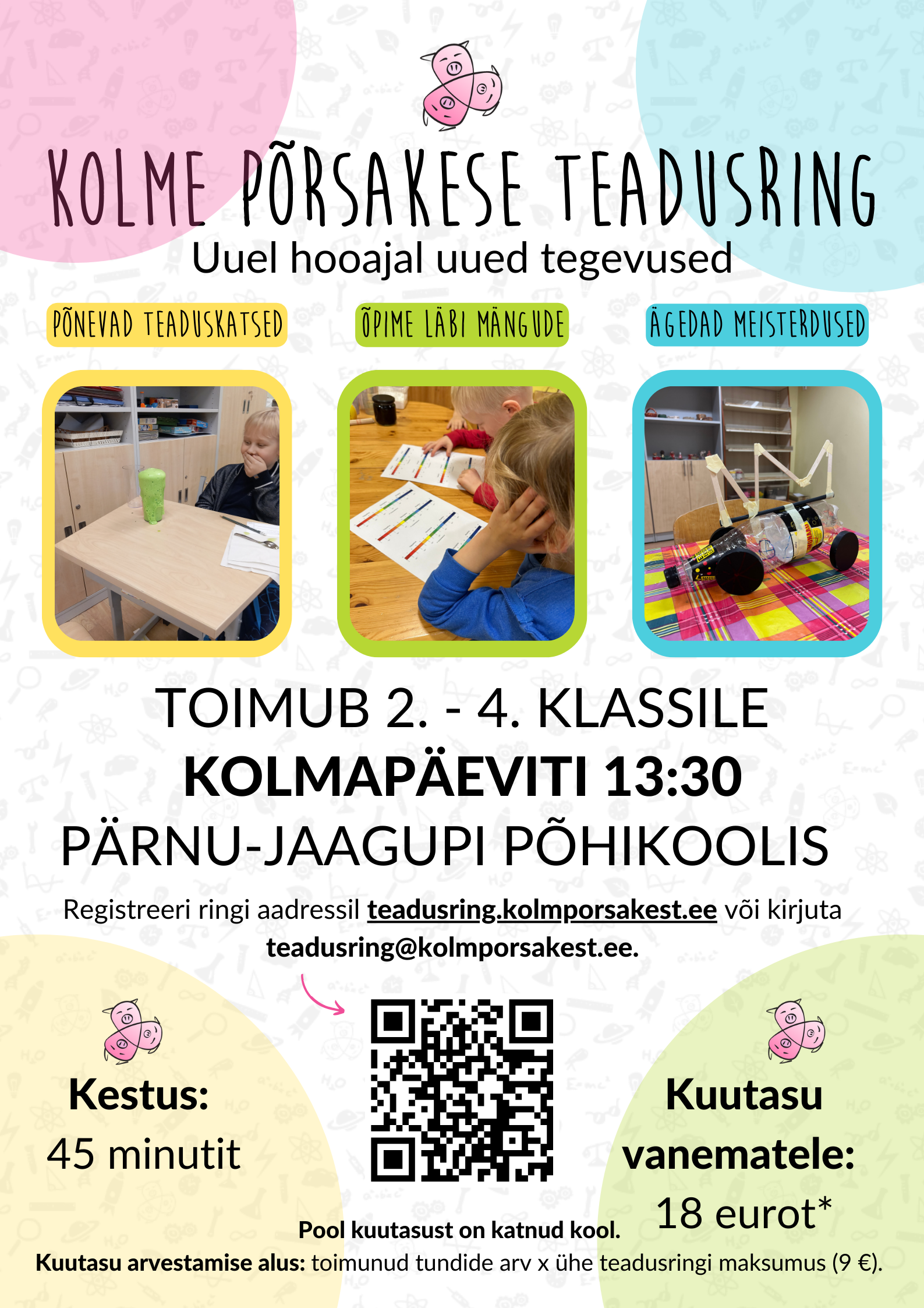 Teadusringi 3 Põrsakest ajad on hetkel ebatäpsed, hakkavad olema kolmapäeval? Täpne info tuleb kohe, kui teada saan. Võimalus on grupi täitumisel osaleda ka 1. klassi õpilastel. Neile tuleb eraldi ring. Olen saanud infot, et soovivad ka I esimese klassi õpilased teadusringis osaleda. Head lapsevanemad, palun andke mulle teada, kes soovivad. NIMI ja VANEMATE kontakt. Info saatke anne.alus@pjkool.ee.