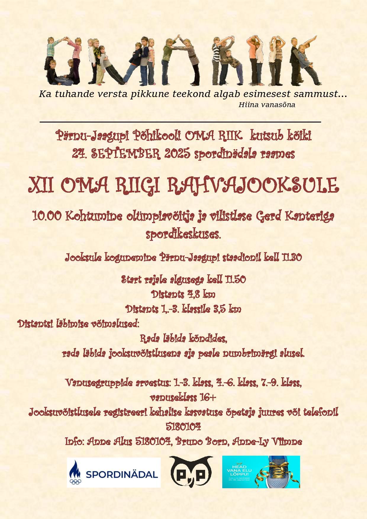 Jooksuvõistlusele registreeri kehalise kasvatuse õpetaja juures või telefonil 5180104